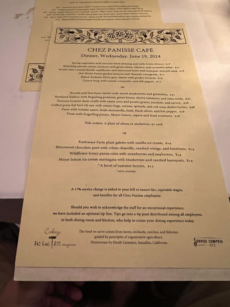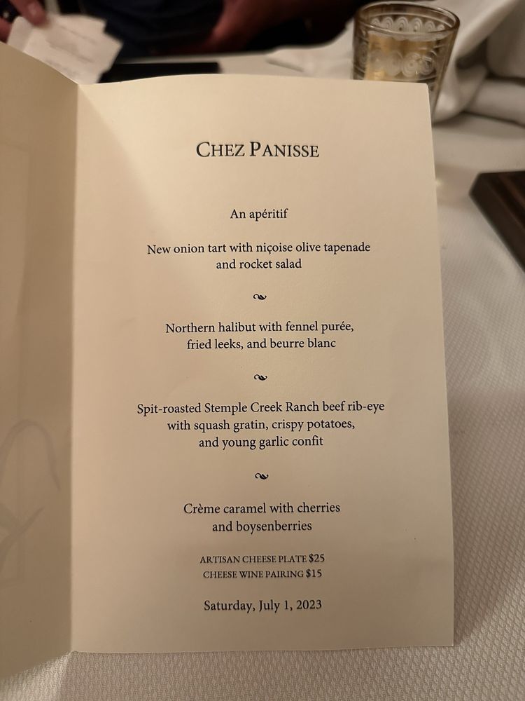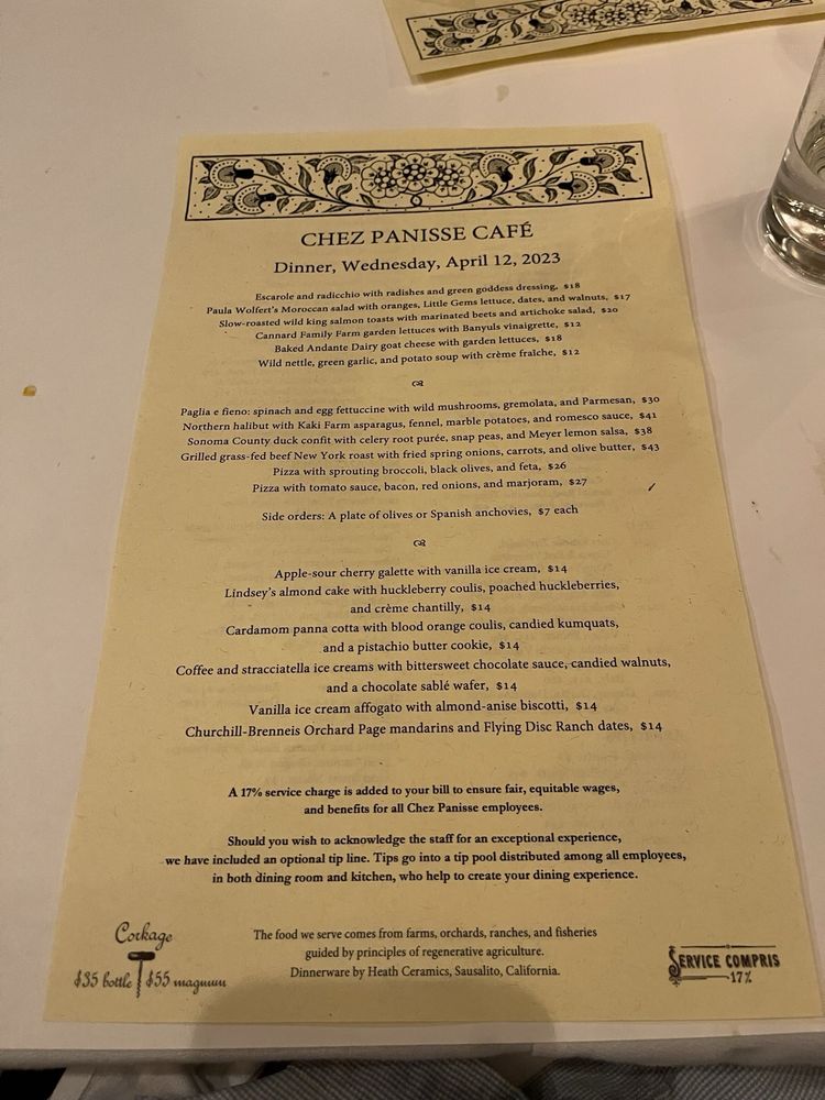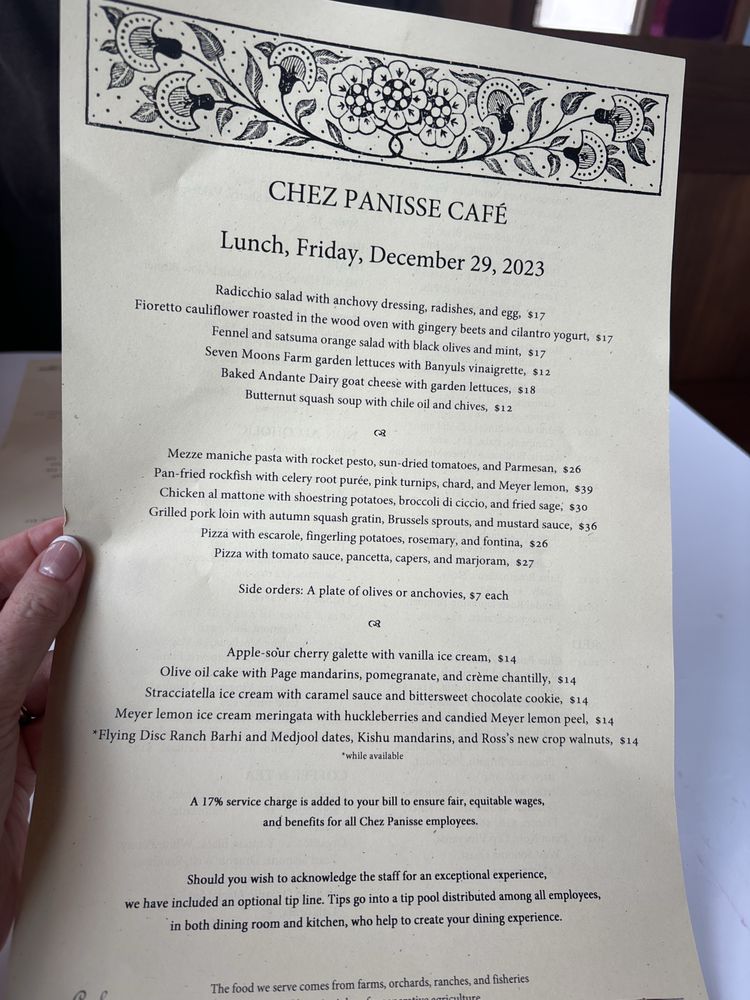 Introducing the menu at Chez Panisse, a renowned farm-to-table restaurant in Berkeley, CA, where fresh, seasonal ingredients shine. The dinner menu boasts enticing options like Cannard Farm Chicories with persimmons and hazelnuts, Smoked Duck Breast with housemade red sauerkraut, and Baked Andante Dairy Goat Cheese. Diners can also enjoy Pizzetta with Gypsy Peppers and Ricotta Salata. The reviews praise the exceptional service, attention to detail, and carefully curated dishes. Customers rave about the delicious food, attentive staff, and cozy ambiance. Chez Panisse offers a unique dining experience, with a focus on quality and sustainability. Don't miss the chance to savor the flavors of this iconic establishment.