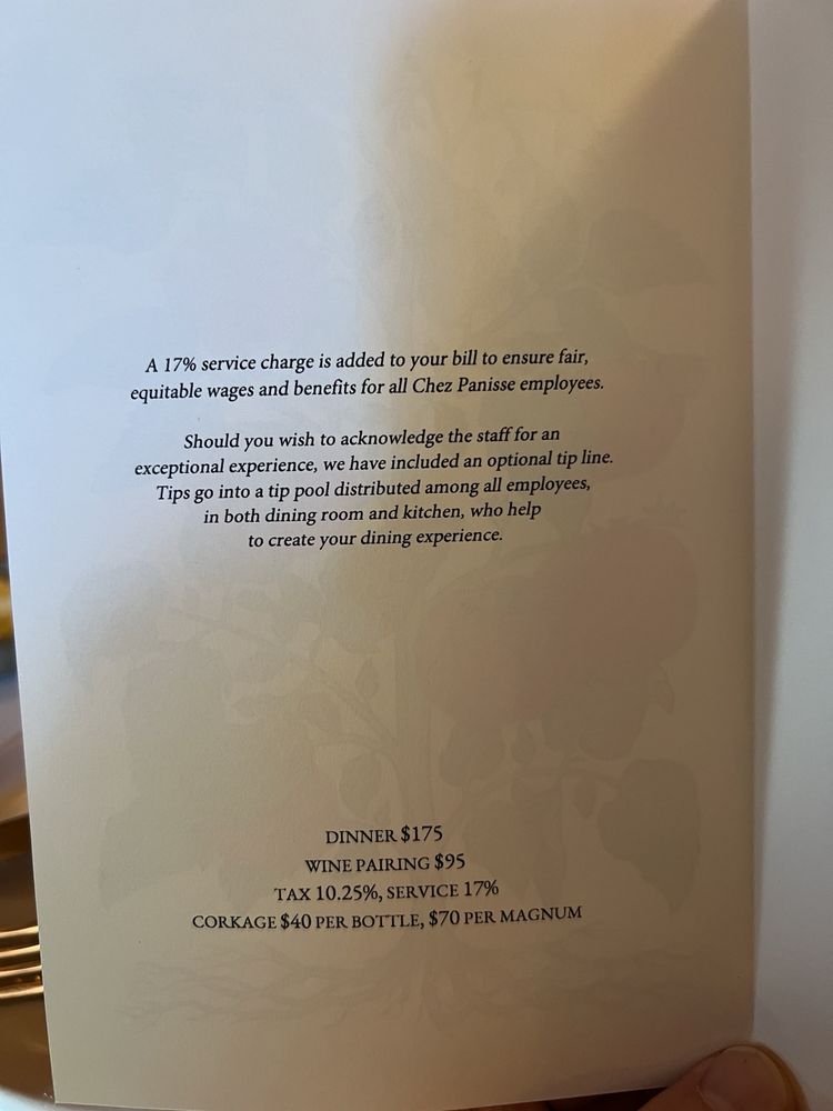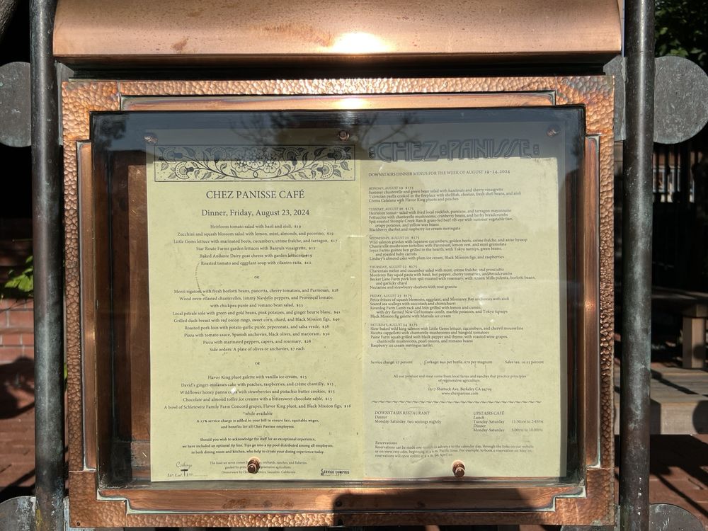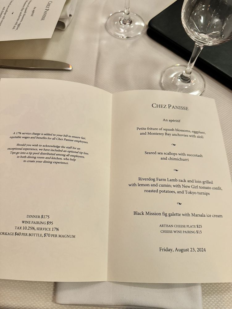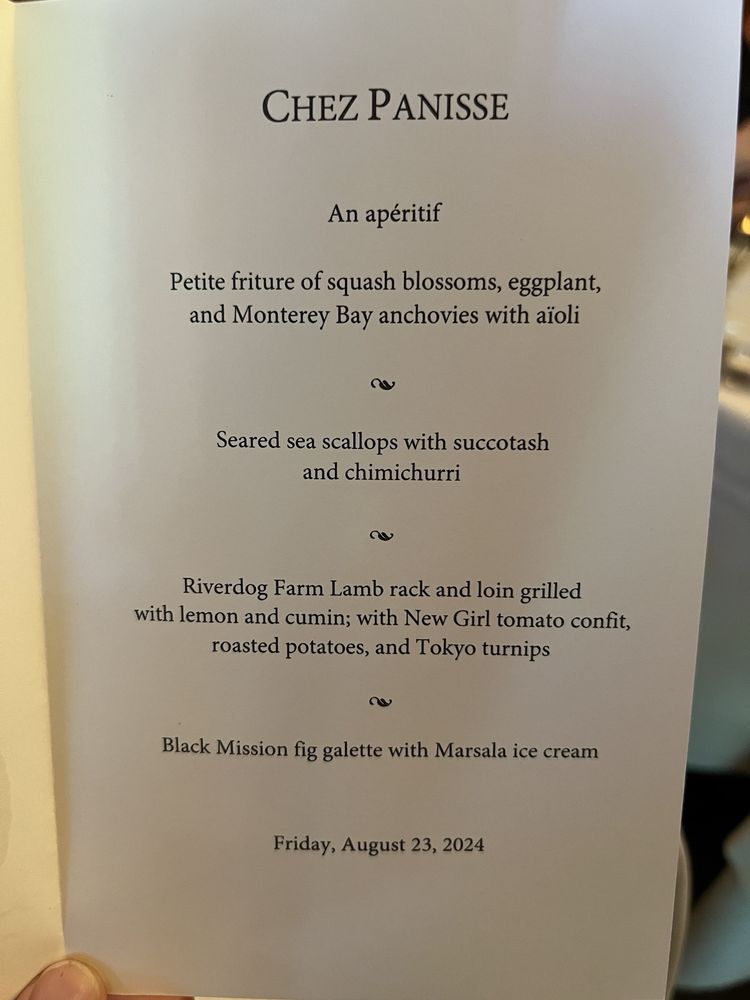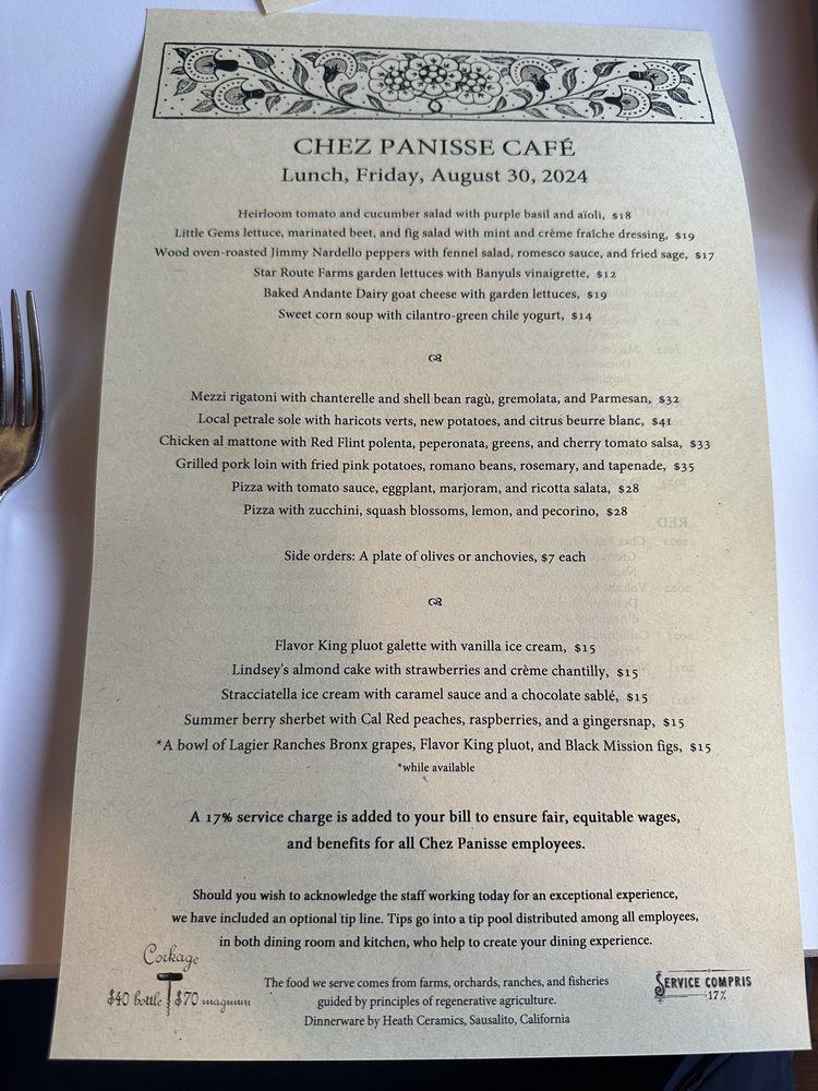 Introducing the menu at Chez Panisse, a renowned farm-to-table restaurant in Berkeley, CA, where fresh, seasonal ingredients shine. The dinner menu boasts enticing options like Cannard Farm Chicories with persimmons and hazelnuts, Smoked Duck Breast with housemade red sauerkraut, and Baked Andante Dairy Goat Cheese. Diners can also enjoy Pizzetta with Gypsy Peppers and Ricotta Salata. The reviews praise the exceptional service, attention to detail, and carefully curated dishes. Customers rave about the delicious food, attentive staff, and cozy ambiance. Chez Panisse offers a unique dining experience, with a focus on quality and sustainability. Don't miss the chance to savor the flavors of this iconic establishment.